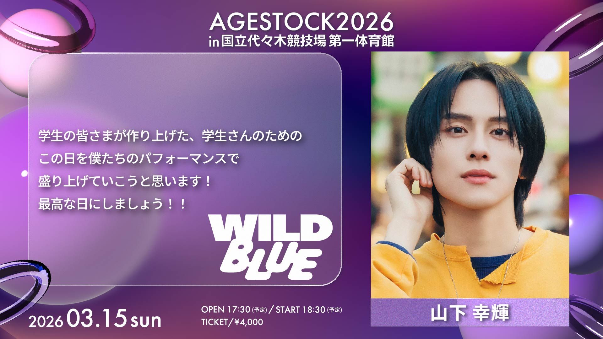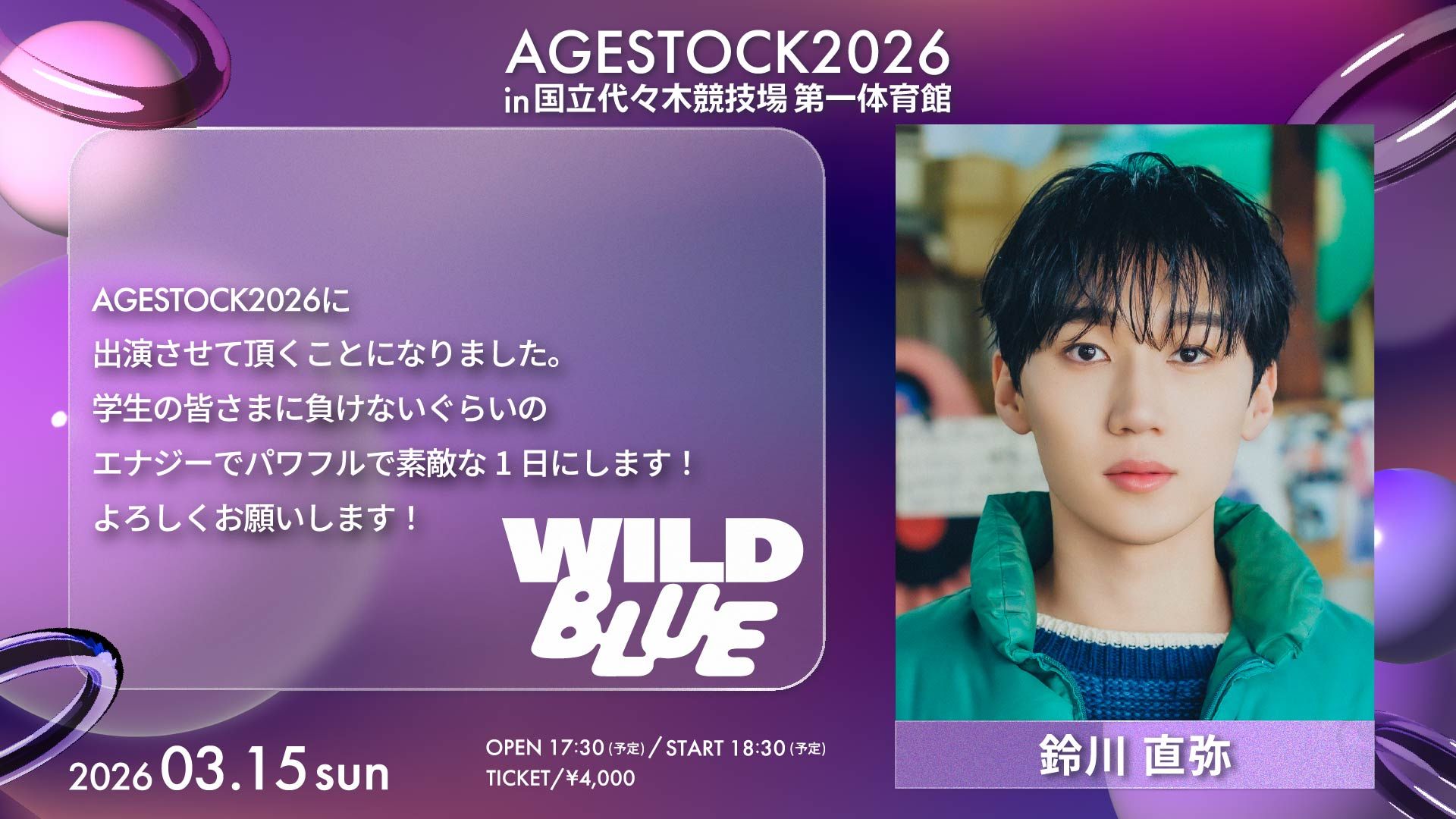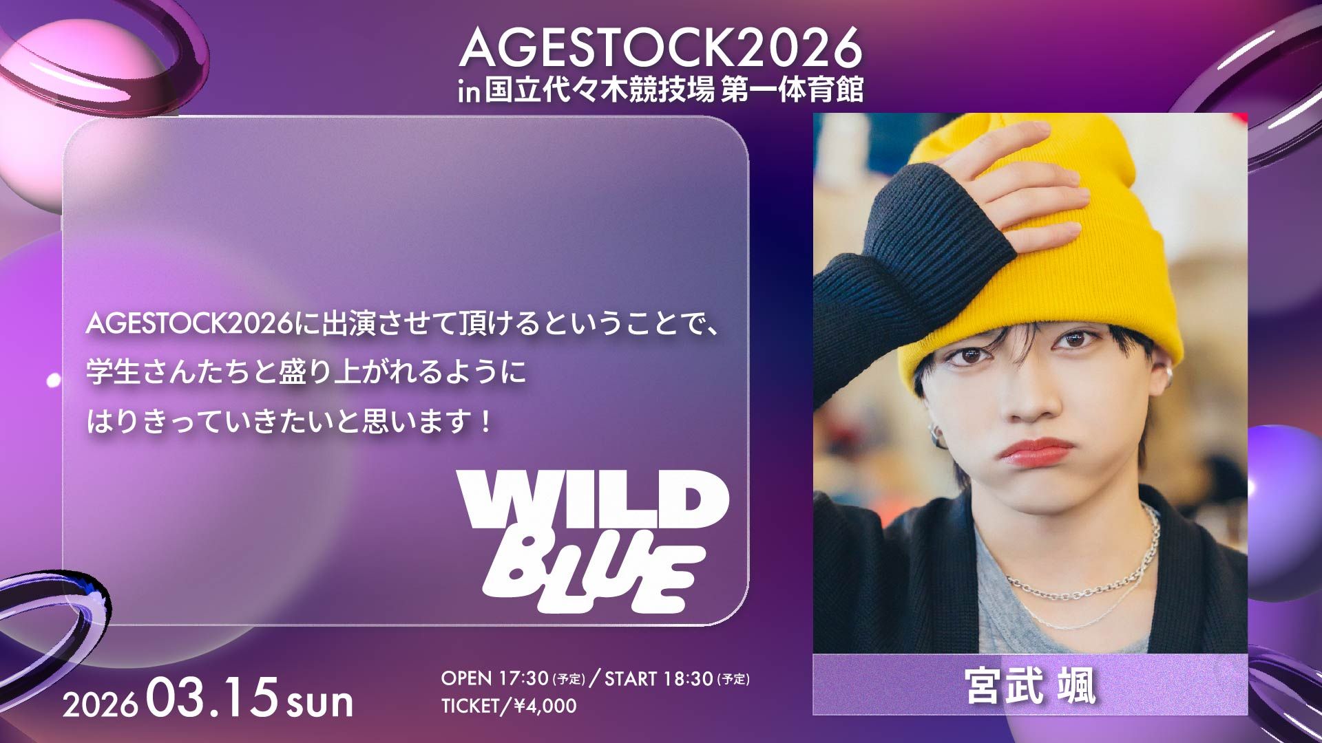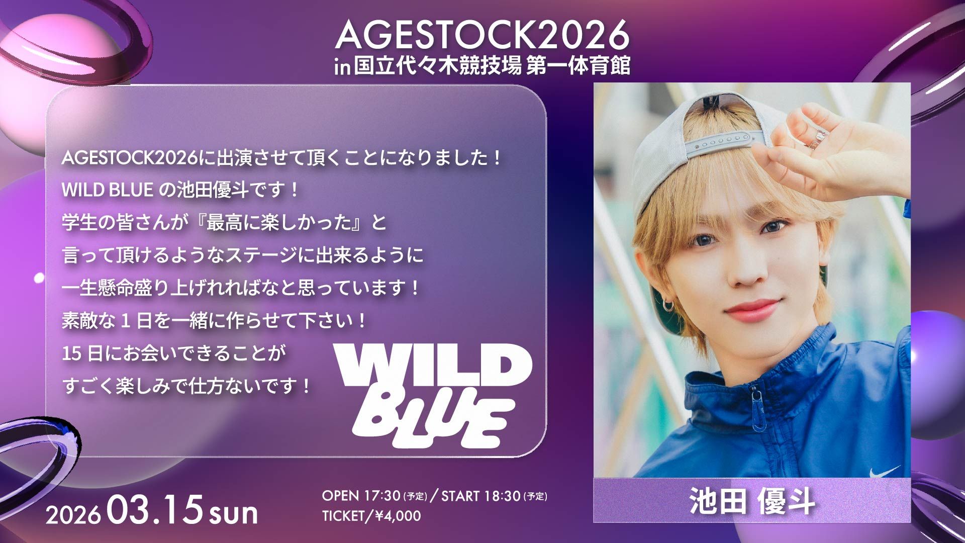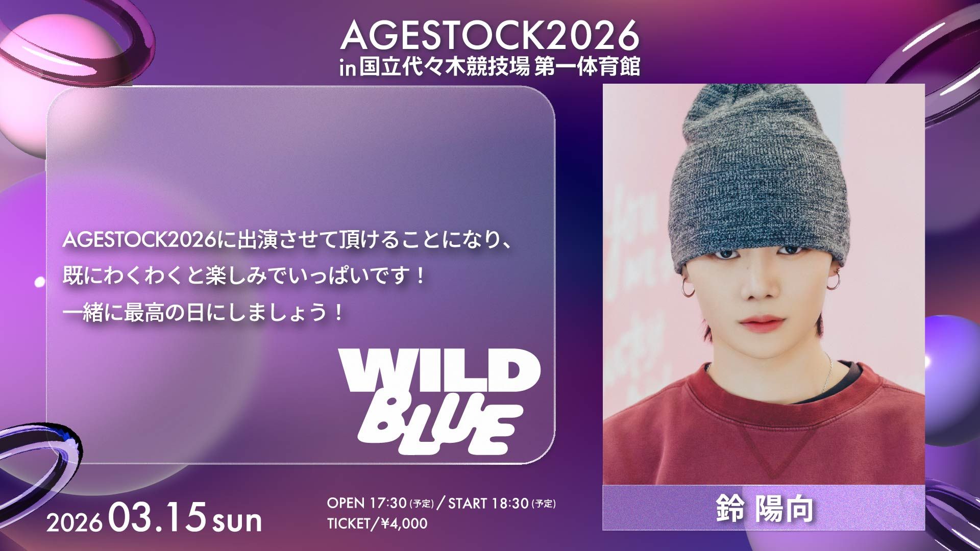NEWS 2026.03.13 LIVE 『AGESTOCK2026 in 国立代々木競技場 第一体育館』WILD BLUEのコメント公開! 3月15日(日)開催!『AGESTOCK2026 in 国立代々木競技場 第一体育館』 WILD BLUEのコメントが公開中! イベント・チケットの詳細はこちら! BACK